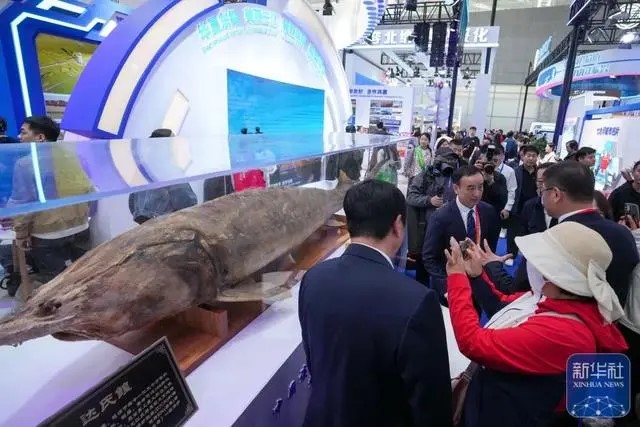 5月18日,参会者在佳木斯展区参观达氏鳇标本。