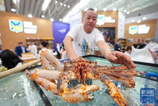 5月18日,一名参展商在展示俄罗斯帝王蟹。