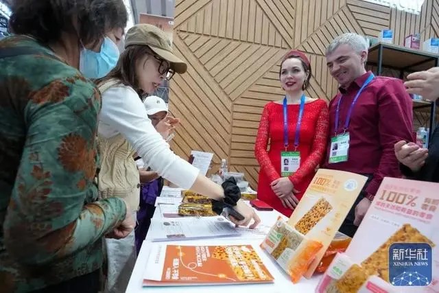 5月18日,一名俄罗斯参展商(中)在介绍蜂蜜产品。