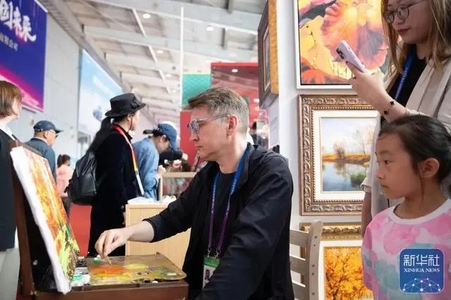 5月18日,一名俄罗斯画家在第八届中俄博览会现场进行创作。