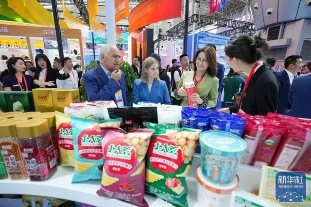 5月18日,几名俄罗斯客商在北大荒集团展区参观。