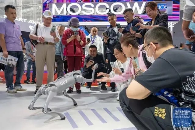 5月18日,参会者在第八届中俄博览会现场与机械狗互动。