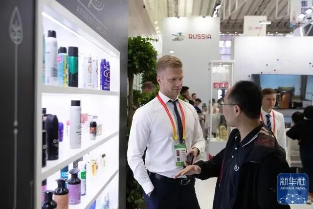 5月18日,在第八届中俄博览会现场,俄罗斯参展商与客户沟通。