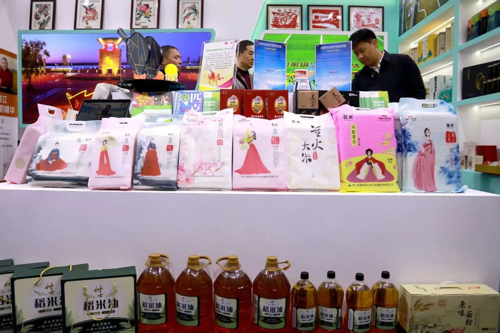 一旁的星火大米展柜前,颗粒饱满的稻米在蒸煮后散发出诱人的香味,包装上的“溯源标签”是每一件黑土优品的满满诚意。