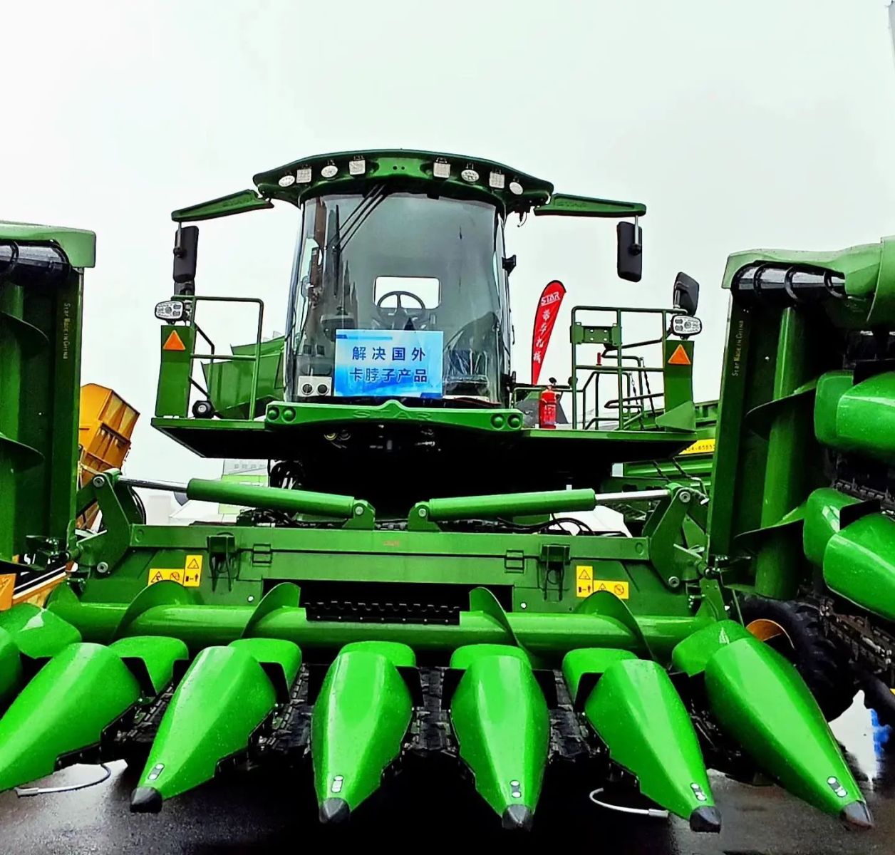 迈入哈洽会大门,一台4米多高的“绿巨人”吸引了不少国外客商驻足停留。这款霸气的自走履带式鲜食玉米收获机来自汤原县振华机械制造有限公司。