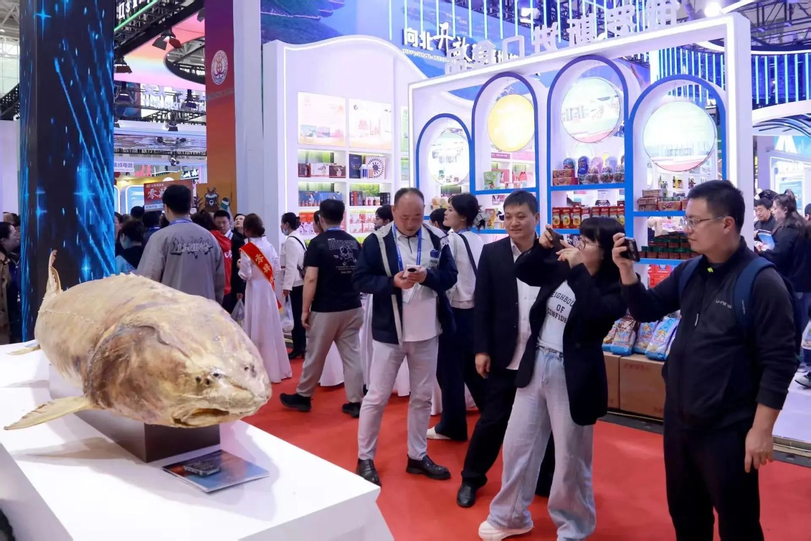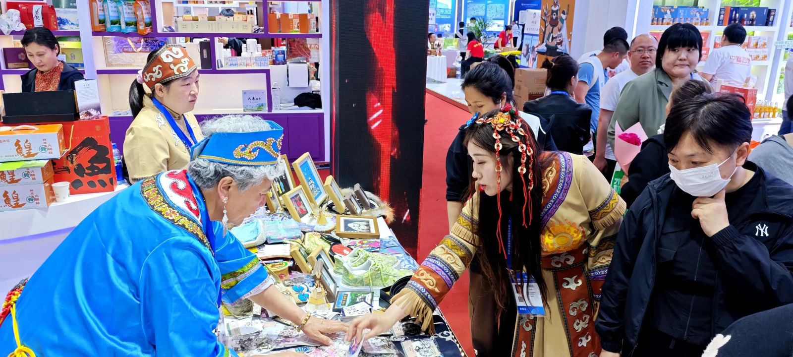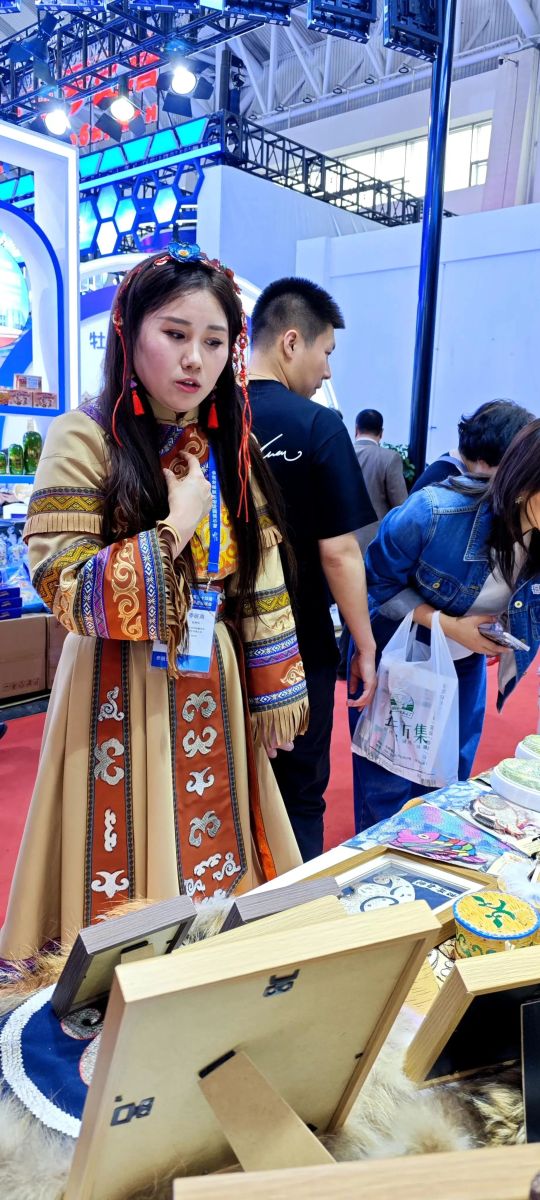 赫哲族艺人指尖翻飞,鱼皮画上跃动着《乌苏里船歌》的粼粼波光;雪地摩托的引擎轰鸣,裹挟着极地寒风的锐意;蔓越莓的果香氤氲,与黑土地的麦浪共酿甜蜜……在佳木斯展区,“新”风铺面,活力满满。