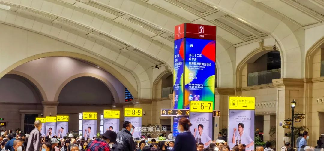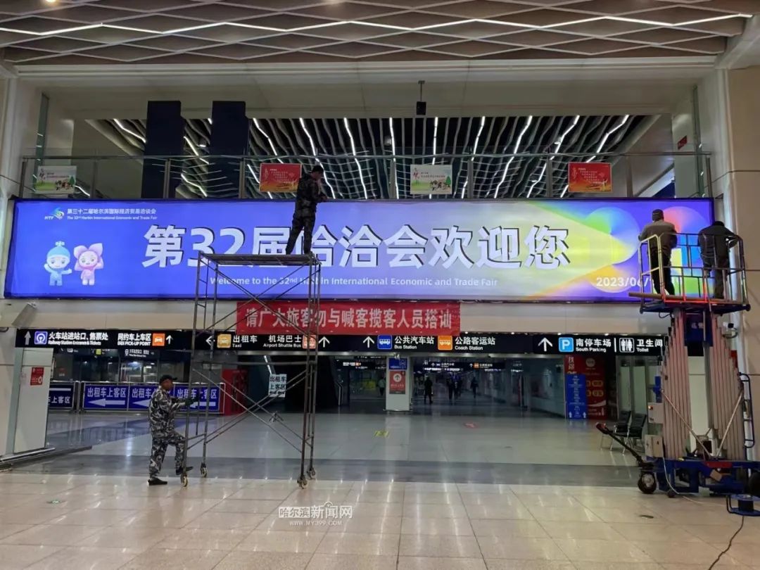 公益宣传覆盖重要点位。南岗区在红军街设置灯杆对其进行喜迎盛会宣传;利用哈站候车厅冰凌花服务台立柱旋转电子屏,动员党政机关、四星级以上宾馆酒店、哈西商圈、秋林商圈、会展商圈商户等多处电子走字屏循环播放喜迎哈洽会的宣传标语;在哈西站候车室内、地下二层换乘大厅等处设置公益广告,并在哈西站东广场出口处利用广播进行宣传;在长江路、中山路适宜区域、沿线天桥等处设置宣传广告。同时,对商圈、景点、会场周边及主要街路上宣传效果不佳、破损蒙尘的围挡广告进行更新,增设哈洽会主题宣传广告。