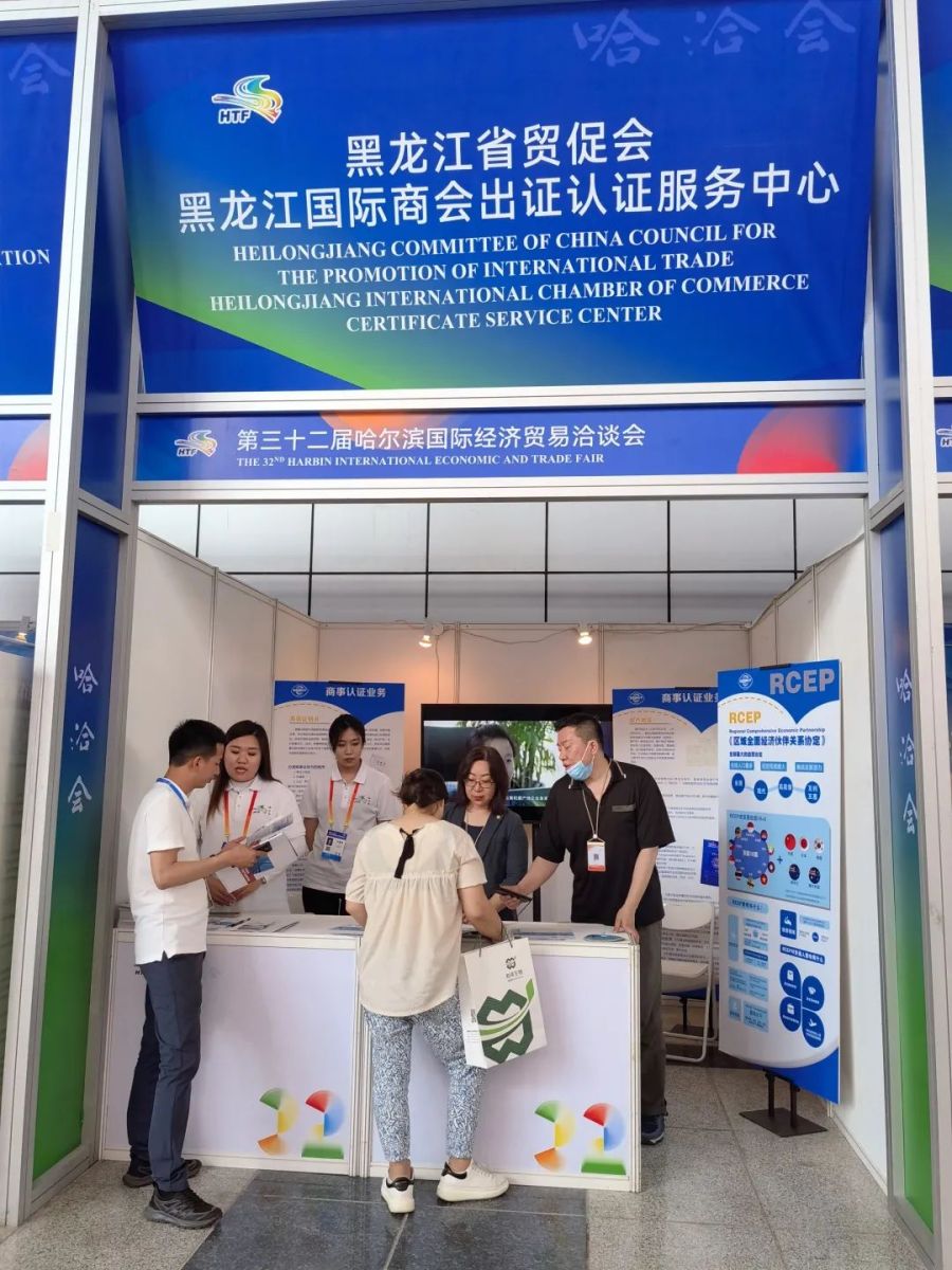 6月15日至19日,第三十二届哈尔滨国际经济贸易洽谈会在哈尔滨国际会展体育中心举办。本届哈洽会以“共建高水平开放新平台,共享高质量发展新机遇”为主题。黑龙江省贸促会作为主办单位之一,充分发挥自身优势,黑龙江国际商会出证认证服务中心在展会现场设立商事认证和自贸协定宣传推介服务台,为参展企业提供区域全面经济伙伴关系协定(RCEP)政策咨询与商事认证业务指导服务。