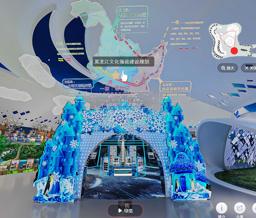 轻轻点击屏幕,率先映入眼帘的是一张充满冰雪特色的游览规划说明图。本届时尚文化展馆以黑龙江文化强省建设规划为游览导向,分为“一核、一带、两廊和三区块”四个领域。展馆内部以走廊的形式,带领您感受龙江的文化魅力。