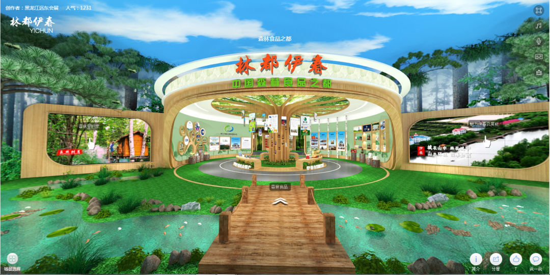 林都伊春VR展厅以“森林里的家”为主题,规划面积1000平方米,整体风格体现了小兴安岭大自然的气息。展厅分7个展区:旅游康养、森林食品、绿色农业、招商推介、木艺玛瑙、工业和科技创新、北药产业,共推介了30余家重点企业,展出具有本地特色的名优产品。