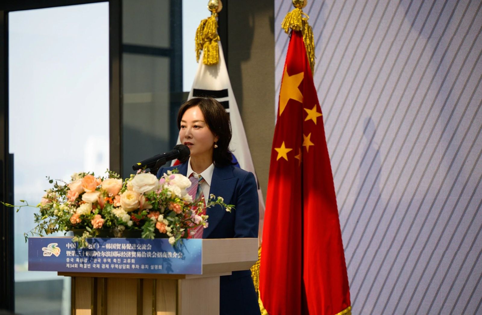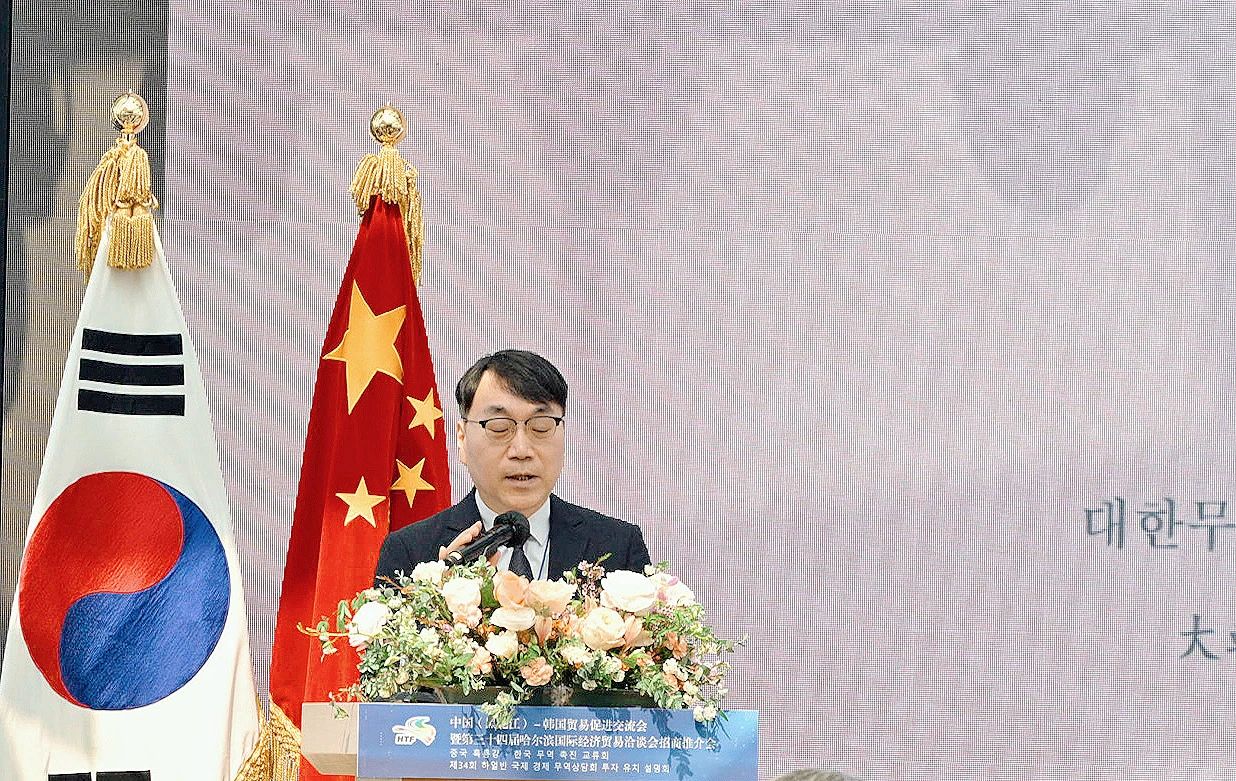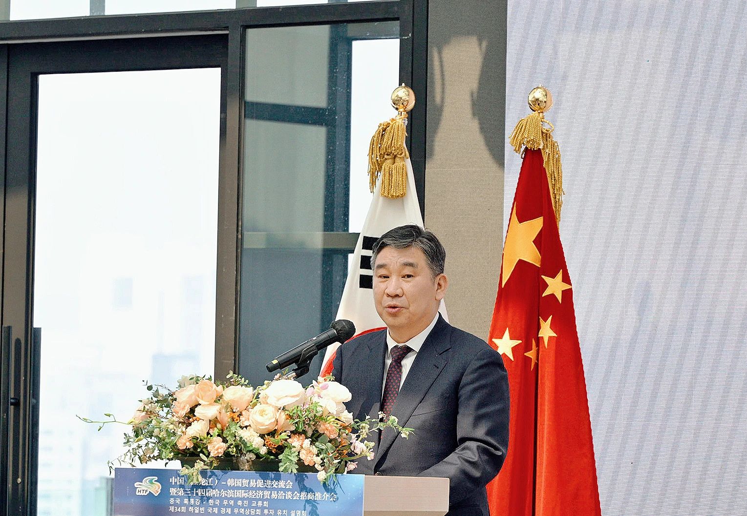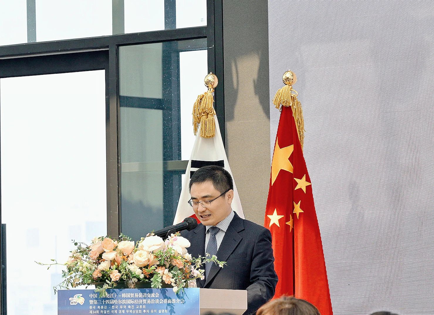 方坤在致辞中指出,中韩两国是搬不走的好邻居,更是利益交融、互利共赢的合作伙伴,建交33年来,两国关系发展取得巨大成就,经贸领域互利合作取得丰硕成果,中国连续20年位居韩国第一大贸易伙伴国,随着中国超大市场规模潜力进一步释放,必将为在华投资企业提供巨大商机和发展动力。哈洽会是中俄经贸合作第一展会,韩国企业可以通过哈洽会深度融入中国北方市场,以及对接俄罗斯及欧洲资源,从而依托黑龙江“东北亚中心腹地”区位优势,借助中俄边境口岸,实现物流、贸易等跨境联动。中国驻韩国大使馆将一如既往发挥桥梁作用,推动黑龙江与韩国经贸合作不断取得新进展。