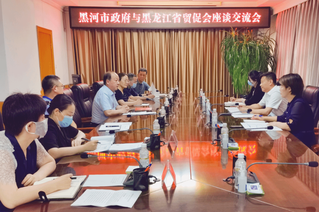 调研过程中,工作组一行与黑河市贸促会、市委宣传部、市发改委、市工信局、市文广旅局、自贸区黑河片区等部门座谈交流,黑河市副市长刘洋主持会议。工作组听取黑河市贸促会关于参加重点展会的有关工作汇报。黑河市将以“主题城市”身份参加第三十二届哈洽会,并积极组织重点企业参加首届国际绿博会,将充分利用展会平台,宣传推介黑河市口岸城市发展新形象;将与黑河市政府及有关部门共同努力,在突出产业优势、行业特色,营商环境建设、招商引资等方面集中发力。同时,了解了黑河市在结合“数字经济、生物经济、冰雪经济、创意设计”产业助推黑河全面发展有关情况。黑河市丰泰机电产品交易有限公司、黑河市坤鹏生物科技有限公司、黑河全域绿色农业发展集团有限公司、黑龙江洋品多商贸有限公司、黑河好食育健康产业有限公司等多家企业参与座谈。