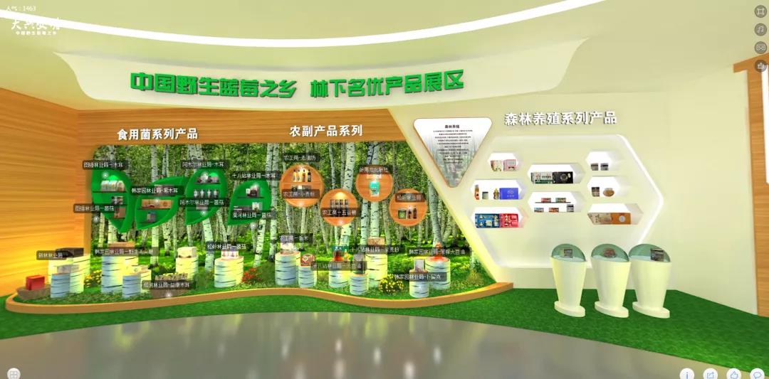 该展厅主体以“VR数字化展厅”形式、2D瀑布流、多样化场景,结合图文、视频、音频等数字信息构成。展厅规划总面积360平方米,设计理念以“林海作伴 冰雪相邀”为主题,采用生态木色为主色调,突出大兴安岭地区独有的生态优势。展厅共由七部分构成,即“中心形象展区”和“六大主题板块”展区,其中六大主题板块展区分别展示:大兴安岭林业集团概况;对外合作展区;中国野生蓝莓之乡-林下名优产品展区;木结构建筑-生物质能源展区;国家森林康养基地-绿色旅游精品展区;矿泉水和矿产资源展区等。其中林下名优参展展品有7个系列近500余种,包括:蓝莓系列产品、食用菌系列产品、北药系列产品、森林养殖、农副产品及矿产资源等。大兴安岭林业集团公司独资企业——神州北极木业,为展厅增加了亮丽的风采,“元宝山庄”以360度虚拟模型全方位展现木屋构造, 被称为“会呼吸的房子”。