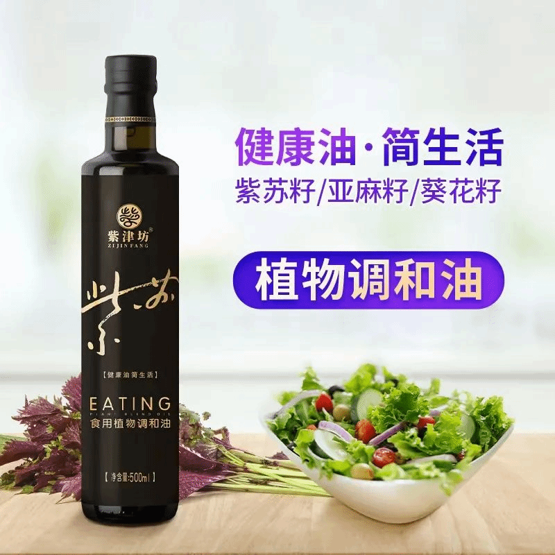 食用植物调和油:含有丰富的α亚麻酸、紫苏籽油、亚麻籽油、葵花籽油经过科学配比的紫苏调和油营养更丰富,富含多种人体必不可少的营养物质,不饱和脂肪比例更科学,具有植物油低饱和脂肪的特性,经常搭配使用紫苏调和油,有益身体健康。