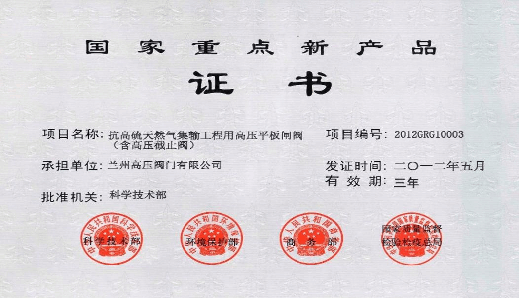抗高硫天然气高压平板闸阀解决了天然气集输工程中的高硫、高酸环境下阀门材料选用、结构设计、质量控制、冶炼工艺等问题,是国内首家通过了“SSC”(标准及模拟工况)和“HIC”(标准)抗硫评定试验。产品满足ISO 15848-1阀门逸散性微泄漏检验标准,“以国代进”为国家节约了十多亿元的投资额。被评定为“国家重点新产品”。