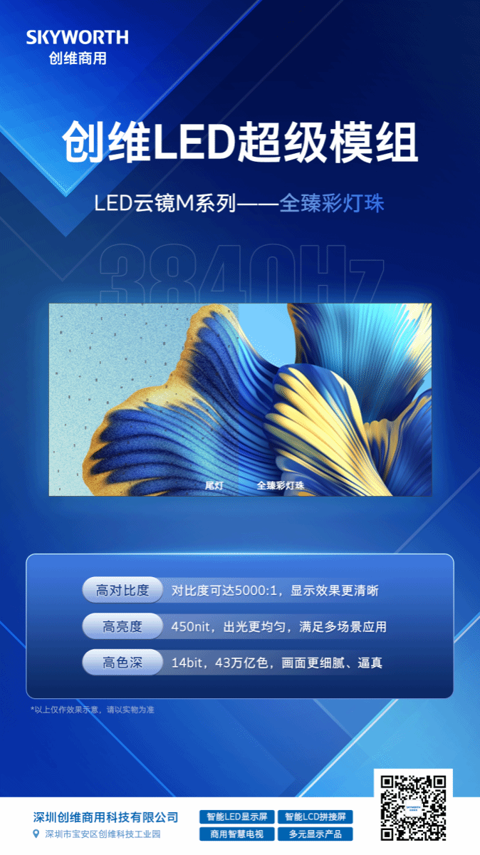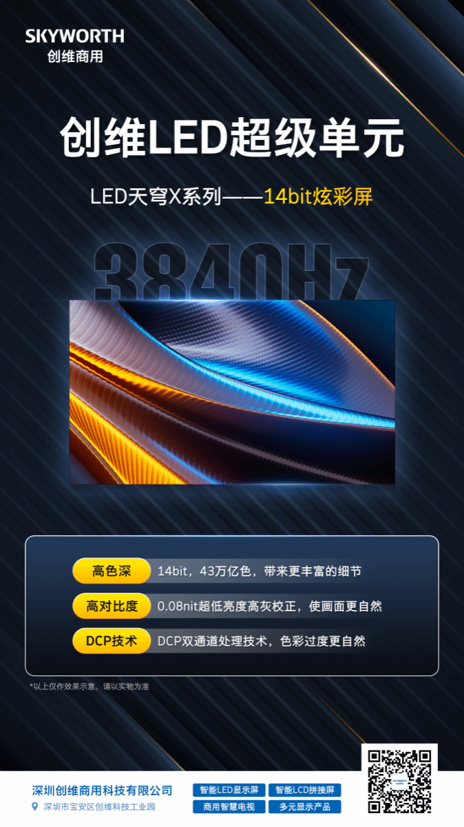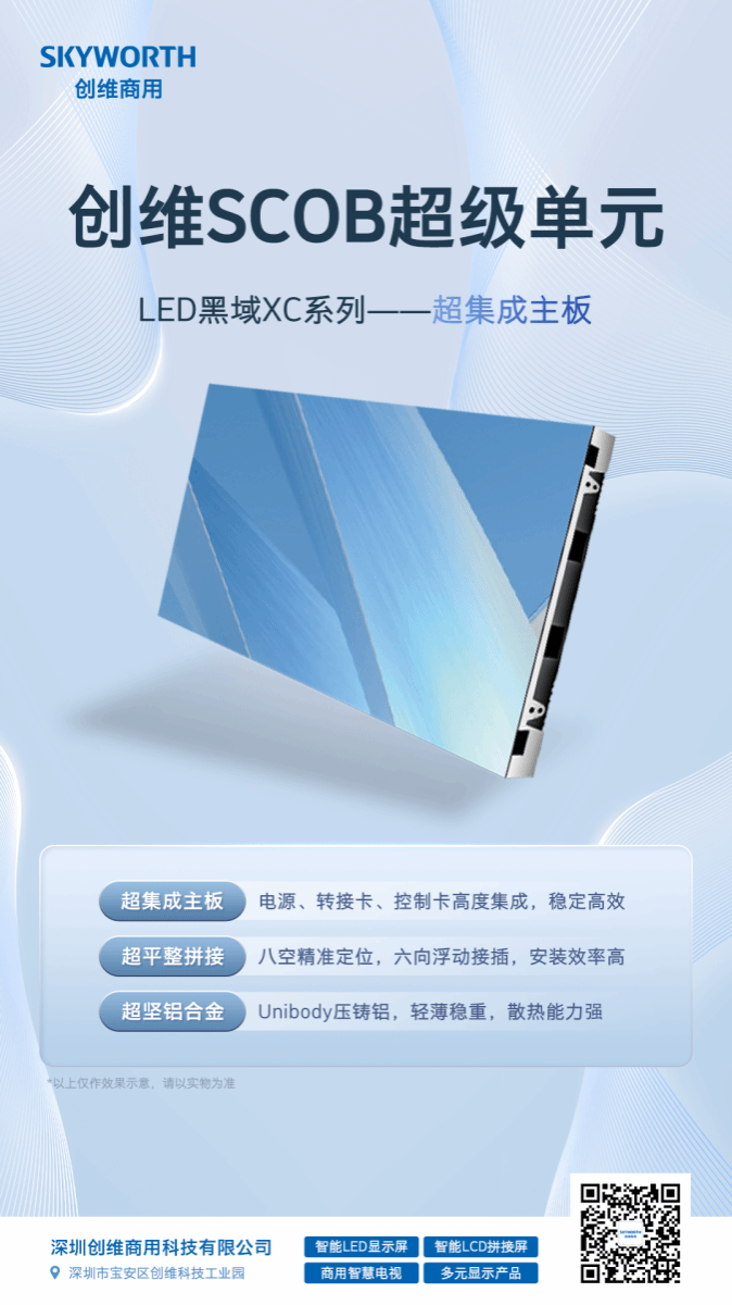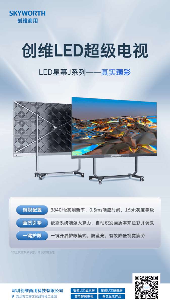 深圳创维商用科技有限公司为深圳创维RGB 电子有限公司全资子公司,主营业务涉及智能 LCD 拼接屏、智能 LED 显示屏.商用智慧巨幕、智慧商用电视、激光电视、AirHub 办公电视、智慧屏等。创维商用不拘泥于现有格局,倾力打造下一代商用智慧解决方案的系列产品,将为我们的商业伙伴在全场景、多角度的商业旅程中保驾护航。“